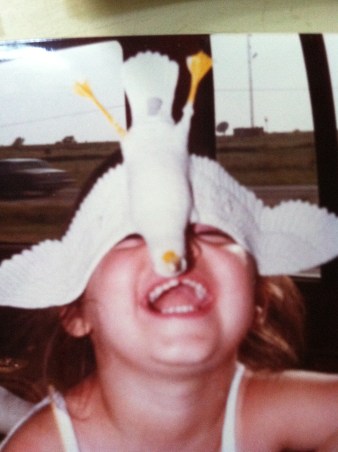 Overly excited about my squeaking seagull we picked up from some beach shop in Galveston. These were the days before built in DVDs or any electronic device. We were able to keep ourselves amused with real objects and loved it!