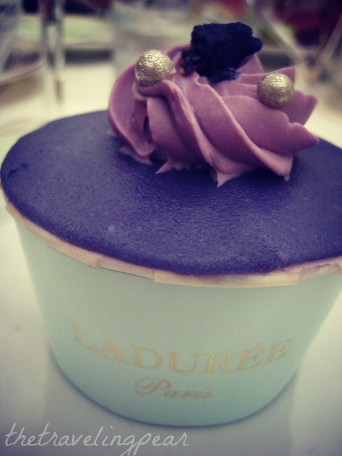 I think we figured it might be so, so, but figured what the heck, why not? In tourist fashion we sauntered in and had the ultimate Ladurée experience. However, the only memorable aspect of the meal was my Marie Antoinette tea and assortment of pastel cuties, aka macarons. The Chef opted for an espresso and an adorable lavender infused cupcake. I think we’d return, especially for the tea and macarons and maybe a mont blanc or possibly a slice of the Marie Antoinette dream cake!