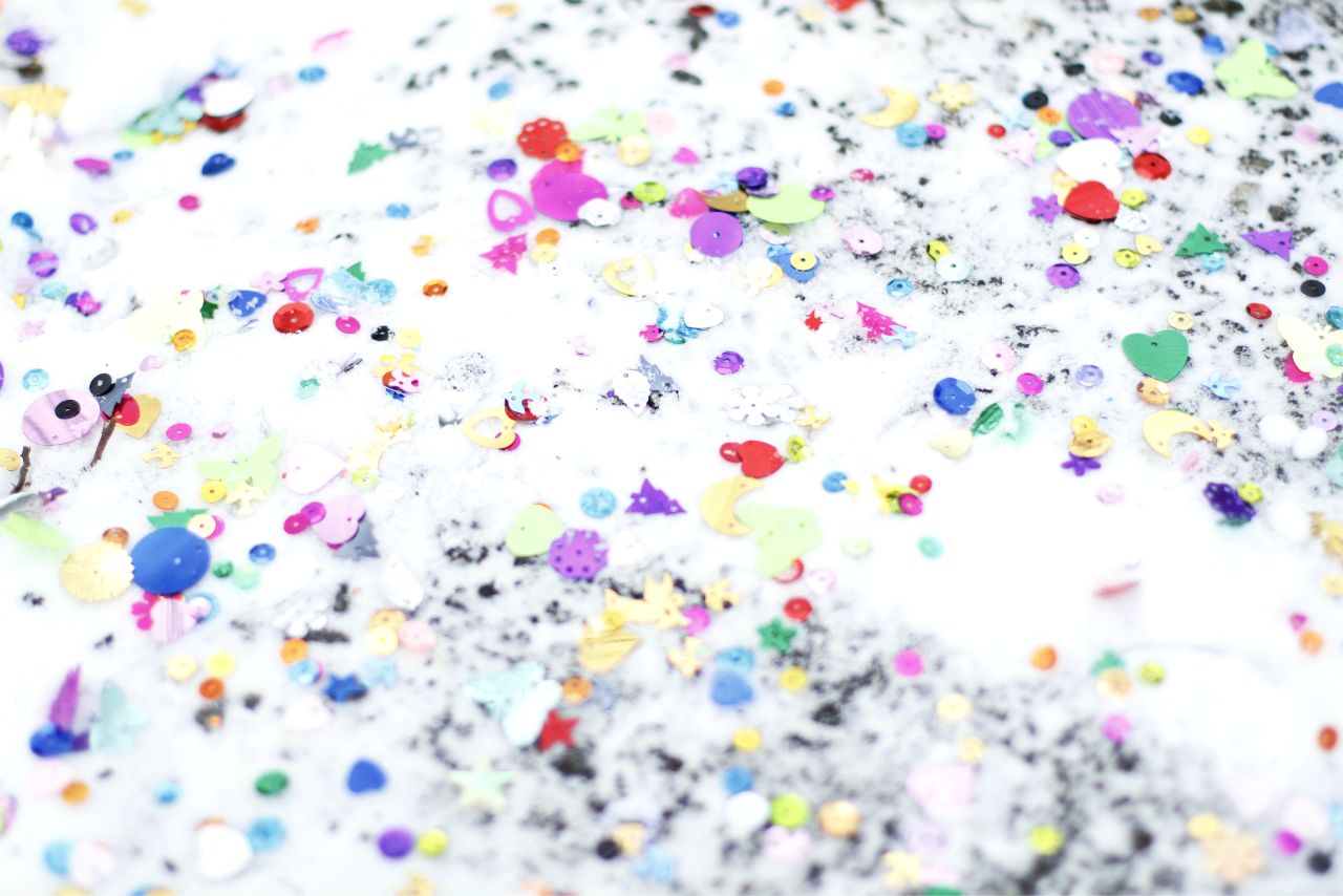 Glitter, even though it’s not a direct gift of mother Earth, is #2. When I was a teacher, my students knew glitter could do no wrong. I didn’t care if it was spilled, glued or flung into the air…the more the better! Oops..you dumped an entire bottle of glitter on your desk–no worries just dust it off…makes the classroom sparkle! (the night sweepers hated me I’m sure). Needless to say a nice portion of my classroom budget went to the replenishment of our glitter supply. Now that I’m without a classroom and students to enjoy the glitter follies with, I make do with the occasional canvas of white that mother nature provides–outside. There’s no night sweepers at our house.